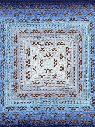 Size: Adjustable. The pattern repeat can be worked any number of times to create a larger or smaller blanket. The pictured blanket is approximately 34” / 86 cm square before blocking and 37.5” / 95 cm square after blocking. It used one whirl and whirlette.