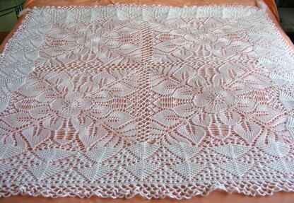 This unusual shawl is made up from 4 squares that have been knitted from the centre out, crocheted together and with a contrast knitted border and crochet edging.