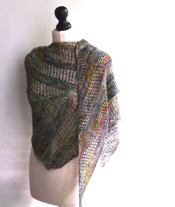 This is the second in a line of one skein shawl shapes. This time a “kite” shaped shawl, using the same stitch pattern as in One skein triangle shawl. Sections of garter stitch and eyelet stitch.