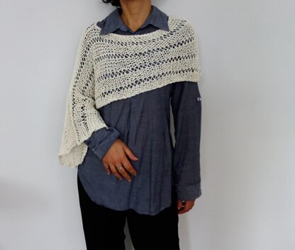 This asymmetrical shrug is designed to cover one sleeve while the other side looks more like a capelet wrapping around your shoulders. Worked flat on large needles, with a subtle lace ribbed effect, creates a delicate pattern that will give a special touch to any garment you wear.
