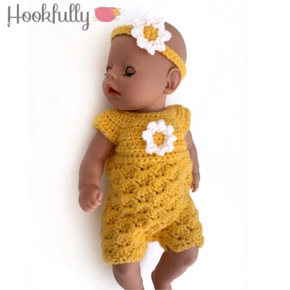 This crochet pattern bundle is for a daisy themed baby dolls romper and headband. The doll clothes are suitable for 14” baby dolls. The dolls romper is crocheted in one piece and the daisies and headband are made separately and are sewn on. The baby dolls romper fastens at the back with a single 15mm button.