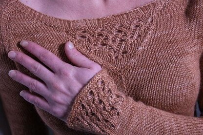 This sweater is knitted from top down seamlessly. You will start with the rib neckline, then you will make raglan increase, then separate body and sleeves, finally you will knit the body in round to end.  There is lace on the neckline from the front. The back is knitted in stockinette stitch with a little lace and  moss stitch in the center. The sweater ends with a lace band. The sleeves will be knitted in round in stockinette stitch      and end with lace.