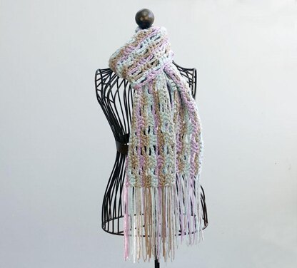 The scarf has an open work pattern and a nice thick fringe.