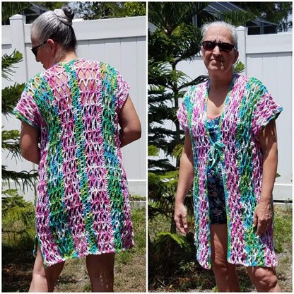 This Cover-Up is a great accessory for the Beach! It is made with a #4 yarn, and is lightweight and easy to wear. Awesome for the Beach!