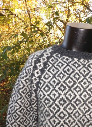 Optur is a sweater/pullover knitted from the bottom edge and up with a 2-color all over pattern. The sweater has a raglan yoke and sleeve construction with long sleeves and traditional rib edges. The pattern is made for at yarn with a gauge of 18 stitches per 10 centimeters (2-color stranded knitting) i.e. a yardage of approximately 90 meters per 50 grams.