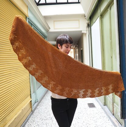 Orage is inspired by a thunderstorm at the end of a warm summer day when natures goes quiet, waiting for the sky to light up in beautiful burnt orange colours. The shawl has a crescent shape worked in garter stitch with yarn over increases. Then a large border is worked straight with alternating lace pannels forming zigzags over a purl background, and backloop ribbing. With its large wingspan, it will lay perfectly on your shoulders or you can wrap yourself in it for the chilly evenings and show off its pretty lace details.