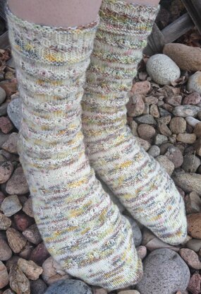 Tiny Moons orbit your socks in garter stitch rings. A soothing knit with an easily memorized 8 stitch repeat and lots of rest rounds.