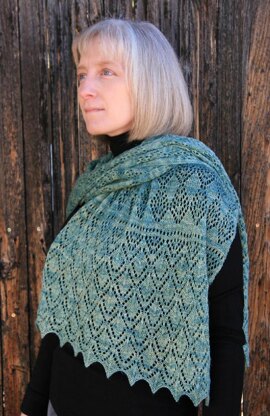 Inspired by the intricate lacy spider webs created by the orbspinner spiders, this laceweight rectangular stole features Estonian lace motifs, with interlocking diamond patterns, edged with leaf-patterned, scalloped-edge borders. The stole is knit beginning with one border through the body, then the second border is knit and the two pieces grafted together.
