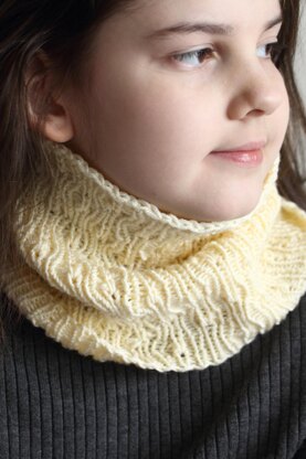 The cowl is knit in the round.