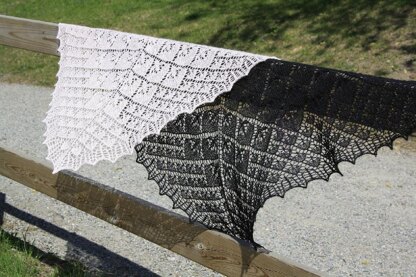 Blocked size of the black sample shawl is 155 x 75 cm (61 x 30 inches) knitted on 2.5mm (US 1½) needles, using 55 grams of JaggerSpun Zephyr Wool-Silk 2/18 (lace weight).