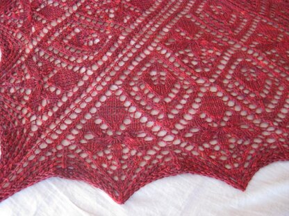 It is knit in Tush from Saffron Dyeworks, and comes in two sizes - large and small. The small shawl takes one skein of Tush and the large size two skeins. small size: width: 152 cm (60”), height 76 cm (30”) large size: width: 194 cm (76”), height 97 cm (38”)