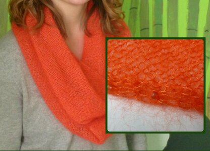 Orenji is knit back and forth on the bias and then the ends are grafted to form a circular cowl. A mohair/silk blend yarn makes Orenji soft and light but surprisingly warm when wrapped twice around the neck. Beads add a subtle (or not so subtle!) accent and a little weight to the edges to help prevent curling.