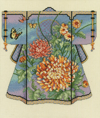 Designed by: Barbara Baatz Hillman. Bring nature-inspired beauty into your home with this elegant Japanese design. This stunning kimono features vibrant chrysanthemums and butterflies.\n