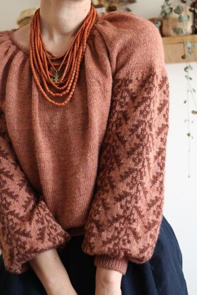 The blouse has a relaxed, slightly oversized fit with a bit of exaggerated wide sleeves. Both body and sleeves are worked top down in the round and gathered at the hem/cuffs.