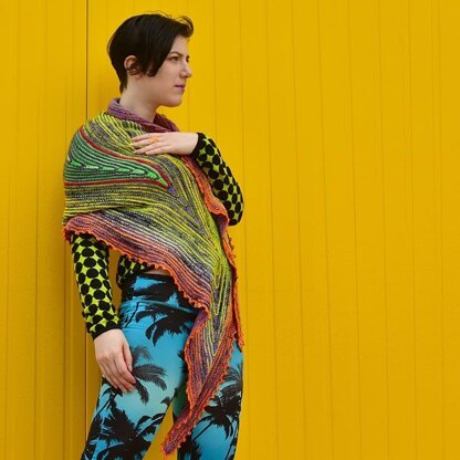 This multicolor almond shaped wrap is worked from the center out in a garter ridge texture. The shape similar to a pointy oval, I choose to wear and style it like a crescent-shaped shawl but it can be worn as a scarf or a shawl depending on the finished size. Because my sample is knit in thin yarn, it often gets used as a scarf, fitting nicely under my spring coat without too much bulk. In the time between finishing this project and posting the pattern, it is one of my most worn pieces of knitting, largely because I enjoy the colors, but also because of the unusual shape and distinctive beaded picot bind off. This is the first time I have tried knitting with beads, and it has proven to be an easy and useful technique to pick up.