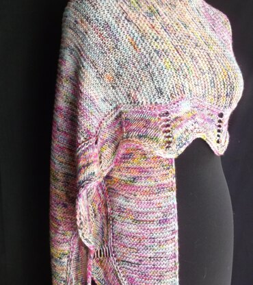 Ottawoz is made holding two strands of Hedgehog fibres skinny singles together. The main body is worked sideways in garter stitch, with increases and decreases to create a crescent shape. An i-cord along the top edge is worked at the same time. Then stitches are picked up along the bottom edge to work a chevron border with double yarn over eyelets.