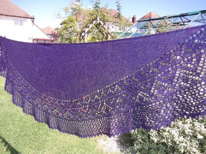 The large purple sample shawl, knitted in fingering yarn, measures 80" along the top edge (wingspan) and is 25" long at the deepest point. However, the size can be adjusted to be larger or smaller, as the knitter wishes, and instructions are provided in the pattern on how to do this. Instructions are also provided for 3 different bindoffs.