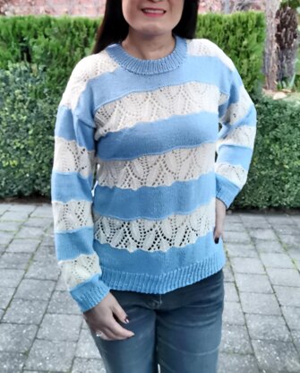 This comfy and relaxed stripe sweater is knitted bottom-up in pieces and features a classic crew neck and modified drop shoulder.
