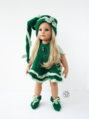 This PDF pattern for a knitted outfit includes a description of knitting dress, hat, shoes.