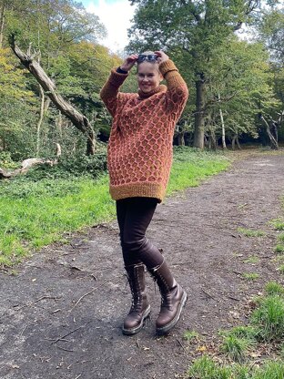 The Oversized Honeycomb Tunic has a loose- fitting body, drop shoulders, high rolled neck and sleeves with fold-back cuffs. The hem, sleeves and neck are finished using rib stitch. The Tunic is worked top down, starting at the top of the roll neck, working increases at drop shoulder seams. The big advantage of working top down is that you can easily adjust the length of the sleeves and body.