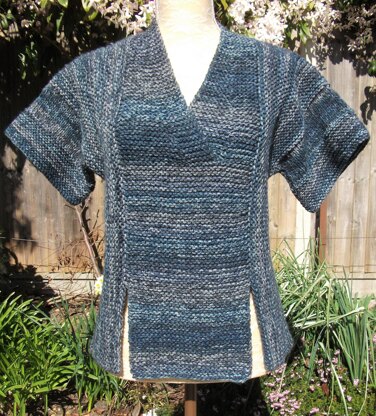 A versatile cross-over v neck top to wear on it’s own or over a shirt, top or thin sweater. The centre, front and back are worked bottom up in garter stitch. The 2 side sections are worked sideways in a mix of garter stitch and stocking stitch bands. The lower edges of the side seams are left open to form side slits. An interesting, easy to make, smart knit!