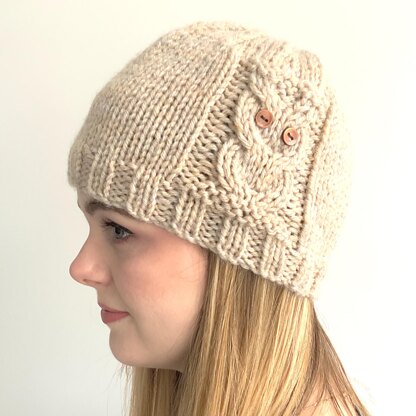 A classic beanie, with a snug fit and a cute owl on the side. Knitted in chunky/bulky yarn, it will keep you lovely and warm in cold weather.