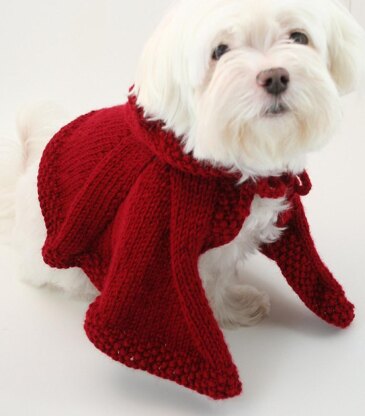 Dog Clothes Red Riding Hood Puppy Cape with Hood. So cute when it swishes around as she twirls! Worked from the neckline down and then the hood is added. Seed stitch edging and decorative YO pattern. Pattern is detailed and easy to follow!