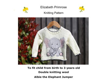 Knit our Albie the Elephant Jumper suitable to fit a child from birth to 3 years old.