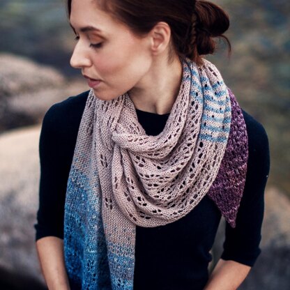 Pacific Sands is a shawl featuring a combination of lace and stranded stitches. It has a beautiful drape, and can be worn as a scarf or shawl.