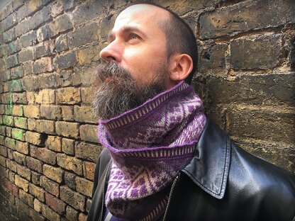 The Paganino Cowl begins and ends with a corrugated rib edging, cycling through all five of the contrast colours. It also features a beautiful and stylish vikkel braid (or Estonian/lateral braid) at both edges, and the main body of the cowl is the 16th-century pattern, rendered with stranded knitting, once again, revolving all five contrasting colours, starting with the darkest, working through to the lightest across the middle, then back to the lightest again at the other side.