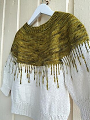 Paint Drips Sweater is a loosely fitted sweater designed to fit for a long time. The top looks like your child has spilt a can of paint over him or herself. It’s top down and it is seamless. Perfect for those new to stranded knitting or knitting with chart. The drips can also be embroider on as duplicate st after the garment is finished. Both options are included in the pattern.