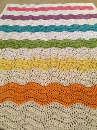 Crisp white cotton and colorful pastels in wavy chevrons create a baby blanket worthy of any nursery. Working into the back loop only adds interesting ridges and texture.