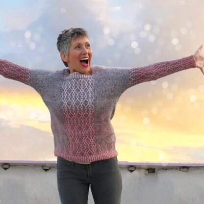 Palace of Winds is worked seamlessly from the top down with drop sleeves, starting from the shoulders and growing down to form the rest of the body. This pullover has a loose line and slim sleeves. The center panel is worked in a “Filigree” technique: a fun and easy way to knit colorwork and cables together, with a subtle and striking effect at the same time.