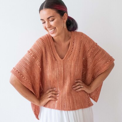 Palazzo is worked sideways, and its textural variety makes the process pretty addictive. Estonian braids, slipped stitches, nupps and eyelets are accompanied by seed stitch and stockinette for a balanced flowy fabric. The finished top has a lot of built-in positive ease and can be worn at least two ways - with a v-neck or a boat neck - which makes it a perfect throw-over piece for when a bit of extra warmth is needed. Nupps and Estonian braids come with video tutorials.