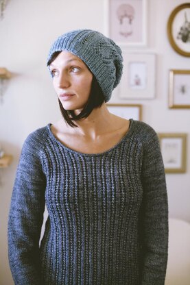 *The A-line body ends with 1x1 ribbing just below the beltline for a comfortable fit and a casual look. The open neckline is finished with a subtle two-stitch applied i-cord. The smooth finish of Tosh DK creates a slightly