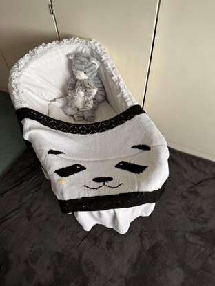 A lovely simple intarsia design baby blanket featuring a panda's face. The design has a black lacy border, gorgeous black and white design face with soft lemon cheeks. This makes it suitable for boys or girls.