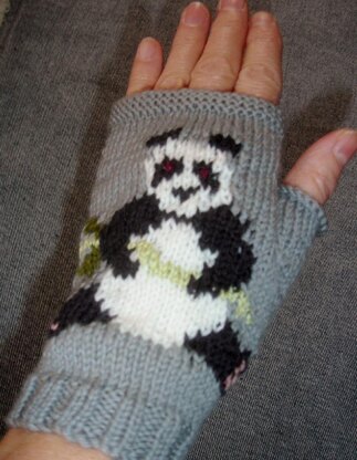 PDF knitting pattern for a pair of fingerless mitts/gloves with a panda on the front of each mitt. The backs of the mitts are plain. The panda is holding a tasty bamboo stalk across his tummy and is knitted using the intarsia method. The gloves could be knitted in plain stocking stich and the panda added afterwards using duplicate stitch. The yarn used for the mitts in the photograph was 4ply weight pure wool for the grey and mauvy-blue mitts and mercerised cotton for the teal mitts. The grey mitts were knitted using Rowan Pure Wool 4ply in Shale (light grey). Any 4ply yarn - wool, cashmere or cotton - can be used for these cute panda fingerless mitts. You will need approximately 30-40gm of the main colour and oddments in black, white, greens, blue and pink for the panda and bamboo stalk. Charts for both left and right mitt are included, along with full knitting instructions. The pattern is suitable for fairly experienced knitters. (c)Twisted Classics