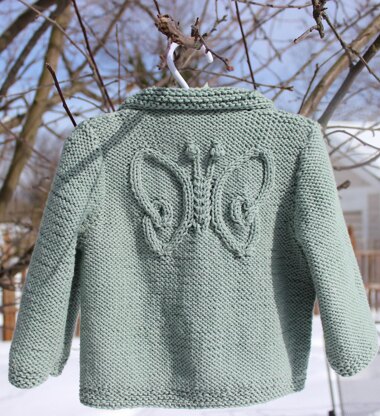 Knit this jacket for a special little one in your life! The back features a knitted-in butterfly motif created completely out of cabled stitches. With a button front and adorable collar, this garment will be a huge hit at any baby shower.