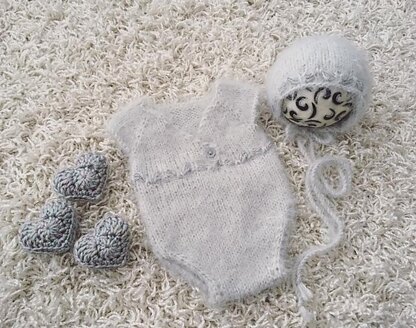 Fits both newborn and 21-22 inch reborn size knit romper set with crochet detail and crocheted mini carpet Pattern THIS IS NOT THE FINISHED ITEM