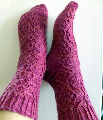 Parenthetical Socks feature a modern take on a traditional twisted-stitch stocking. Use a solid or a semi-solid yarn in a lighter color to best display the intricate twists and turns!