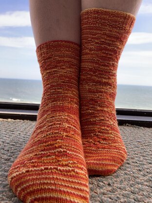 These socks are worked cuff down with a diamond shaped slipped stitch pattern. With the slipped stitches, tonal yarns work well.