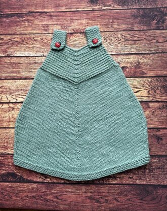 Parsley is a seamless pinafore style dress knit from the top down worked first flat and then in the round. Only finishing required is to sew on the two buttons.