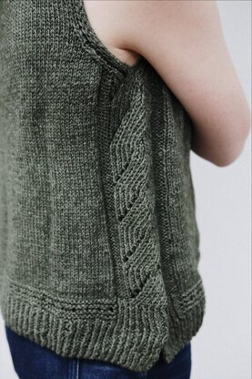 Parsley is an easy, breezy tank with lots of beautiful details. It has a split hem with twisted rib faux cables travelling up the side panels. Tubular selvedges frame the armholes beautifully.
