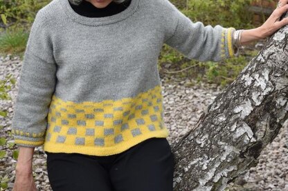 Paruline is a short and slightly oversized pullover, knit from the bottom up to the armholes. The back and the front are then knit separately and joined at the shoulders on three needles. Stitches are picked up around the armholes and the sleeves are knit from the top down in the round. It is of course possible to knit a longer jumper or to extend the sleeves. The ample sleeve is gathered in at the cuff. The jumper features a yellow and grey pattern band on the lower half. A strip of small yellow squares is knit on the bottom edge of the sleeves and they are finished with an I-cord edge. Stitches are picked up around the neckline to finish the neckband. It is an easy pattern to knit and has no seam.