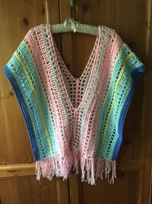 This is such a quick and easy project. It’s perfect as a cool and airy cover-up for warmer weather. If you’re like me, there are times you need a little extra coverage, but not necessarily the warmth that goes with it. Enter this poncho. I wore it on a very warm day and was still very comfortable. I designed it with lots of holes for that very purpose! :) I used leftover cotton yarn that I had on hand and was really pleased at how it turned out. But feel free to use any colors you want. I think this would look lovely in a solid color, too. Materials: Crochet hook size J Peaches and Creme yarn in these colors (you will use very little of the Ecru and Sunshine) - Pastel Pink - 3 skeins Aquamarine - 2 skeins Blueberry - 1 skein Ecru - 1 skein Sunshine - 1 skein
