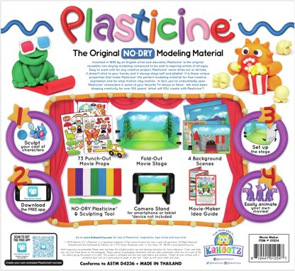 Create and film your own animated movies. This creative kit comes with a blockbuster collection of props, scenes, tools, and lots of inspiration to show you how to make your own stop-motion movies. Download the FREE app, create your characters, set the stage, and get rolling with the Plasticine Movie Maker Studio! Camera-enabled smart device required but not included. This 12x11 inch package contains one fold-out movie stage, four background scenes, 73 punch-out movie props, no-dry plasticine and sculpting tool, camera stand for smartphone or tablet, movie-maker idea guide. Recommended ages five years and up. WARNING: Choking Hazard. Not suitable for children under 3 years. Conforms to ASTM D4236. Imported.