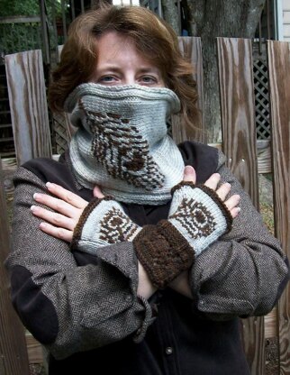 Yarn: Knit Picks Swish [100% Superwash Merino; 220 yards/100g], MC: 1 skein Pearlescent Tonal, CC: 1 skein Kindling Tonal Gauge: 20 stitches = 4” (10 cm), 26 rows= 4” (10 cm) in stockinette stitch Needles: US Size 7-8 (4.5-5mm) straights, and dpns. Notions: Tapestry needle, waste yarn, stitch marker Sample Finished Size: Cowl: 21” (53 cm) circumference, 9“ (22.5 cm) wide unstretched Mitts: fits up to 9” (22.5 cm) around palm