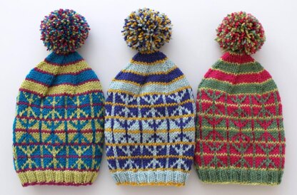 A hat inspired by maps. Grid lines and squares represent the distance measures on a map and diagonal directions on a compass. There is a repeating Fair Isle style motif around the head using four colours. A contrast colour is used part way through the pattern to create additional interest. Concentric rings reminiscent of contour lines rise up the crown, topped off with a colourful pompom. The pattern also has instructions for a three colour version.