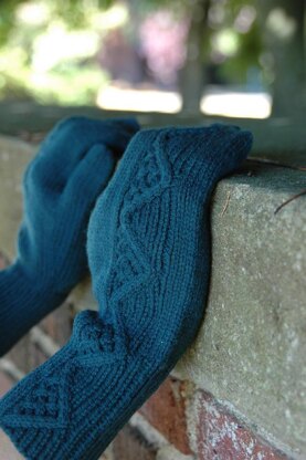 A wonderful cable and twist stitch pattern, mirrored on each mitten, emerges from 1/1 rib and travels up the entire length of these comfy mittens, which also feature a gusseted thumb and grafted top.
