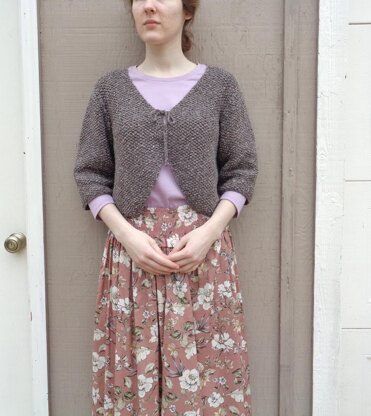 A cropped bolero shape paired with a slightly rustic yarn for an easy to wear shrug. All the details are here for a chic, comfortable sweater – v neck, curved fronts with ties, and 3⁄4 length set-in sleeves.